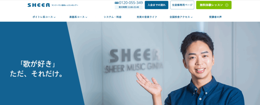 【PR】シアーミュージック 今回はミュージックスクールのサイトのご紹介です。北海道から九州まで全国100校舎展開しています。平日は学校や会社の近く・休日は自宅の近くなど、いつでも好きな場所でレッスンを受けることができちゃいます!☆コースの紹介☆ボイトレ系コースボーカル&ボイストレーニングコース・カラオケ・ジュニアボーカル・話し方・声優・ボイスフィット楽器系コースピアノ・エレキギター・アコースティックギター・ベース・ウクレレ・ドラム・サックス・バイオリン・DTM※楽器はレンタルできるので自分の楽器を持っていなくても大丈夫です!「未経験だけど大丈夫?」「周りのレベルが高かったらどうしよう」と心配になる方も多いかと思います。当スクールでは自分のペースに合わせてレッスンを進めていきます。音楽活動をしてみたい方も、趣味で楽しみたい方もそれぞれに合ったオーディションやイベントがたくさんありますので是非参加して取り組んでみてはいかがでしょうか?気になるコースがある方、新しい趣味を見つけたい方、音楽活動に取り組んでみたい方はぜひ下記のボタンから体験レッスンへ(^▽^)/ 体験レッスンはこちら レッスンのポイント POINT1 レッスンはマンツーマン 「未経験だけどついていけるのか」、「レベルが高かったらどうしよう」と心配しなくても大丈夫!マンツーマンレッスンなのであなたの生徒さんの目的やペースに合わせて進めていくことができます。 POINT2 相性の良い講師を選べる レッスンは担当制ではなく、学びたい内容やジャンルに合わせて講師を選ぶことができます。色々な講師のレッスンを受講して自分にぴったりの講師を見つけてみては? POINT3 複数コースを受講できる 月の回数内であれば、コースも自由に選択可能です。やりたいことに合わせてレッスンを組み立てられますね。例えば、ボイストレーニングを受けながらピアノなどのレッスンを受講して引き語りなどに挑戦することもできます! POINT4 好きな日時を選べる 曜日や日時の固定はありません。サイトでレッスンの空き状況を確認して自分のスケジュールに合わせて受講することができます。Webからも電話からも受講予約をすることができます。 POINT5 都合に合わせて校舎を選べる 当レッスンは全国の校舎でレッスンの受講が可能です。職場や学校の近く、自宅の近くなど都合に合わせた場所でレッスンを受講することができます。※体験レッスンを申し込んだ校舎以外でも入会後レッスンを受講することができます。 POINT6 2ブースレッスン 感染対策として講師と生徒でそれぞれ1ブースずつ利用し、別れてレッスンを行っています。 料金について ・趣味で楽器や歌を習ってみたい方・集団でなく、マンツーマンでレッスンを受けたい方・音楽活動に力を入れたい方・レッスンの会場や時間が固定でなく、学校や仕事などと並行して自分のタイミングでレッスンを受講したい方・空いた時間を趣味などの時間に活用したい方・様々なコースを体験してみたい方・自分に合った講師を見つけたい方など少しでも興味がある方はぜひ下記のバナーをクリック! 商材名 シアーミュージック運営者 A.S※当サイトはアフェリエイトプログラムを利用し宣伝目的で作成しております。