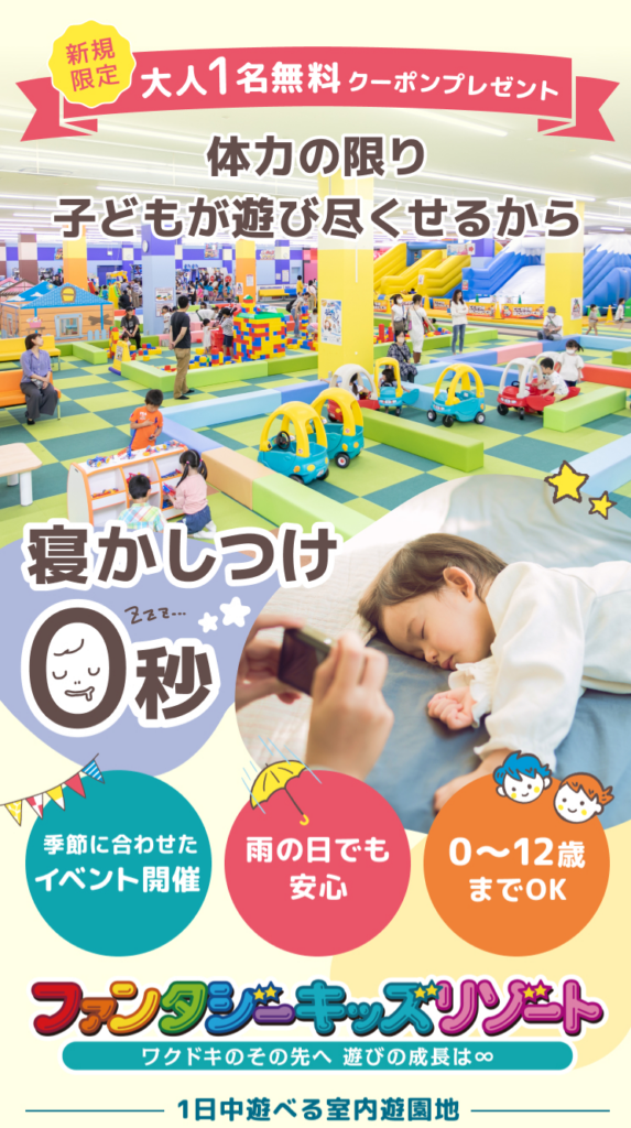 【PR】ファンタジーキッズリゾート 今回は1日中遊べる遊園地のサイトのご紹介です。この遊園地は北海道・埼玉県・千葉県(2店舗)・東京都(2店舗)・神奈川県(2店舗)・愛知県・福岡県の7つの都道県・10店舗あります。対象年齢は0~12歳。幅広いですが、それぞれの年齢にあったエリアやアトラクションがあります!長時間たっぷり遊べて時間が足りない!などの声もいただいているそうです。 1日中遊べる室内遊園地のメリット・天候を気にせず1日中遊べる・万全の安全対策・種類豊富なアトラクションと大きな公園のような広さ・幅広い年齢に対応したあそび(アトラクション・イベント)・ダンスライブやグリーティング、縁日などの体験型エンターテイメント・長期休暇(主に春・夏・冬休み)ごとのシーズンイベント開催・ミルキッズ(0歳〜2歳)専用のエリアで赤ちゃんでも遊べる・授乳室やおむつ替え設備完備・レストラン、カフェ設置店舗あり ※レストランやカフェがない店舗は持ち込みOK+冷凍食品の販売あり 料金について(武蔵村山店の場合)年間費・更新費 400円 会員カードは1家族1枚。有効期限は発行日から1年間。☆ファンタジーパック(遊び放題) 平日1400円/休日1900円/ハイシーズン200円☆トワイライトパック 平日1150円(15:00~閉店まで・平日のみ)☆タイムパック(最初の1時間) 平日730円(延長370円/30分)/休日1000円(延長500円/30分)/ハイシーズン1050円(延長530円/30分)☆0歳児は無料です。☆2025年12月20日~2026年1月12日は平日も含めてハイシーズン料金となります。営業時間:10:00~18:00☆今なら新規限定大人1名様に無料クーポン発行中!! 0歳~12歳のお子様がいるご家庭で、休日どこに遊びに行こうか悩んでいる方、天候に左右されずに遊びたい方、クーポンや詳しい料金などは、ぜひ下記のボタンをクリックしてサイトをチェック! チケット購入はこちら 体力の限り遊び尽くせる理由 1.飽きずに遊べる種類豊富なアトラクション ふわふわの遊具や乗り物・ごっこ遊びなど盛りだくさん!0歳~12歳までの幅広い年齢層に合わせた遊びが1日中たっぷりと体験できます(^▽^)/ 2. 子供がはハマる体験型イベント ダンスライブで楽しく運動したり、縁日やビンゴ大会など楽しく参加できるイベントも開催中です。※縁日など別途料金がかかるイベントがあります。※店舗によって開催時期や内容が異なる場合があります。 3.雨の日でも関係なし!広い室内でのびのび 大きな公園みたいに自由に動き回れます!全店舗屋内型の施設だから暑い日も寒い日も雨の日も親子で楽しめます。 4.年齢別エリアで小さなお子様も遊べる ハイハイ・よちよち歩き・猛ダッシュ!と年齢によって変わるお子様の動きに合わせてえエリアを分けています。0歳児からも楽しめるようにオムツ替えスペース、授乳室、ミルク用調合サーバー、ベビーベットも完備されています。 よくある質問 Q中でお食事はできますか?A新さっぽろ店・印西…・船橋店・名古屋北店・福岡店・北神尾店はお食事の持ち物が可能です。武蔵村山店・多摩店・海老名店、港北店は店内レストランをご利用ください。Q途中退場はできますか?A「ファンタジーパック(1日遊び放題プラン」または「トワイライトパック(夕方から遊べるプラン)」でご入場される場合は途中退出可能となっています。お子様を店内に残しての一時退出や「タイムパック(時間課金制プラン)」でご入場されてる方は一時退出はできません。 今回ご紹介している室内の遊園地は、たくさんの遊具とイベントがあり、どんな天気の日でも体力の限り遊び尽くせると思います。体力がある限り、たくさん体を動かすから夜もぐっすり眠れちゃいます!天候に左右されず、1日中遊べちゃいます!クーポンも発行されているようなので、下記のバナーをクリックしてチェック!